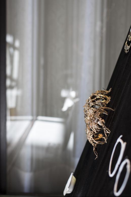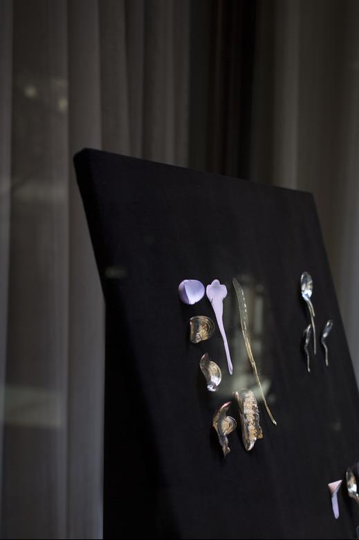 Gamwell uses a sophisticated technical process involving bone china, phosphate dyes, water, and semiprecious metals to create sculptural objects that seductively straddle the line between the fine and applied arts. The result is beautifully disconcerting: fine china and flatware firmly reimagined through the chaotic logic of the natural world.