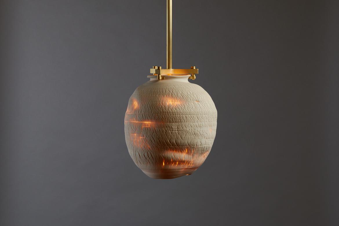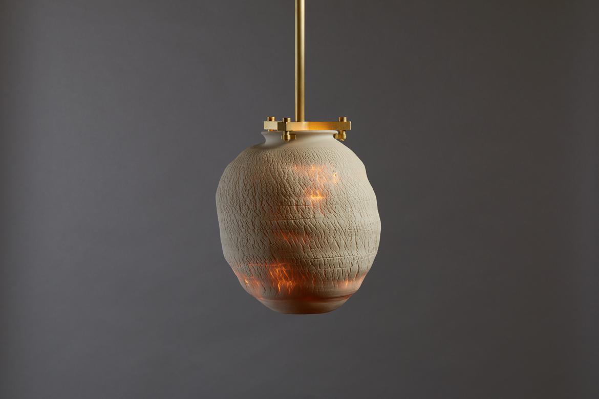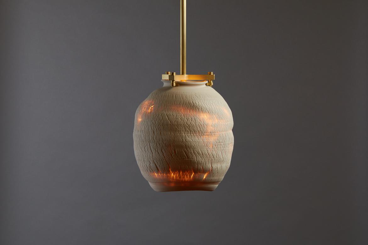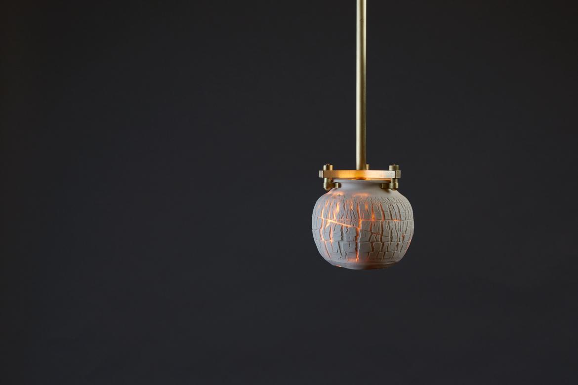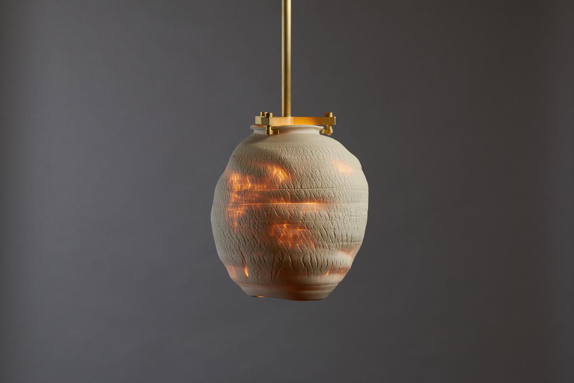Inspired by the beauty of a dried-out desert lake bed, each piece is a handmade one-of-a-kind object that produces a mysterious quality when internally lit, embracing the flaws and accidents inherent in the craft and process of making: the series exemplifies the wabi-sabi ethos of acceptance of transience and imperfection.