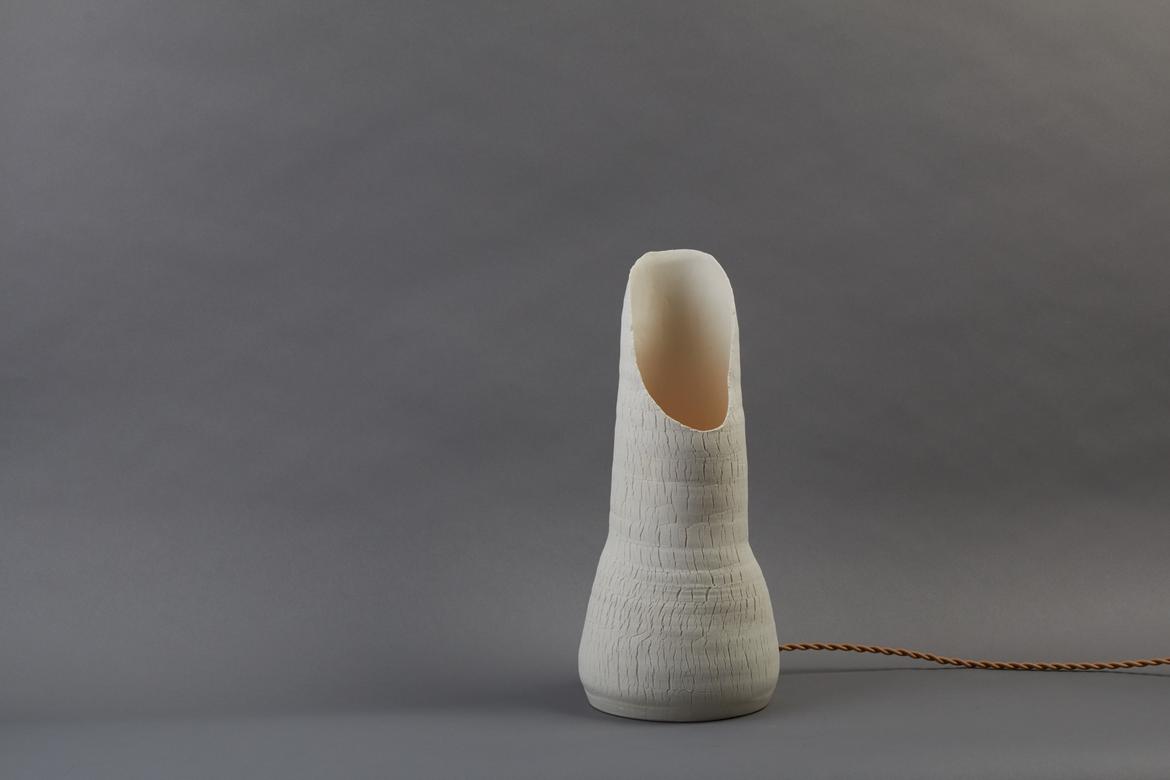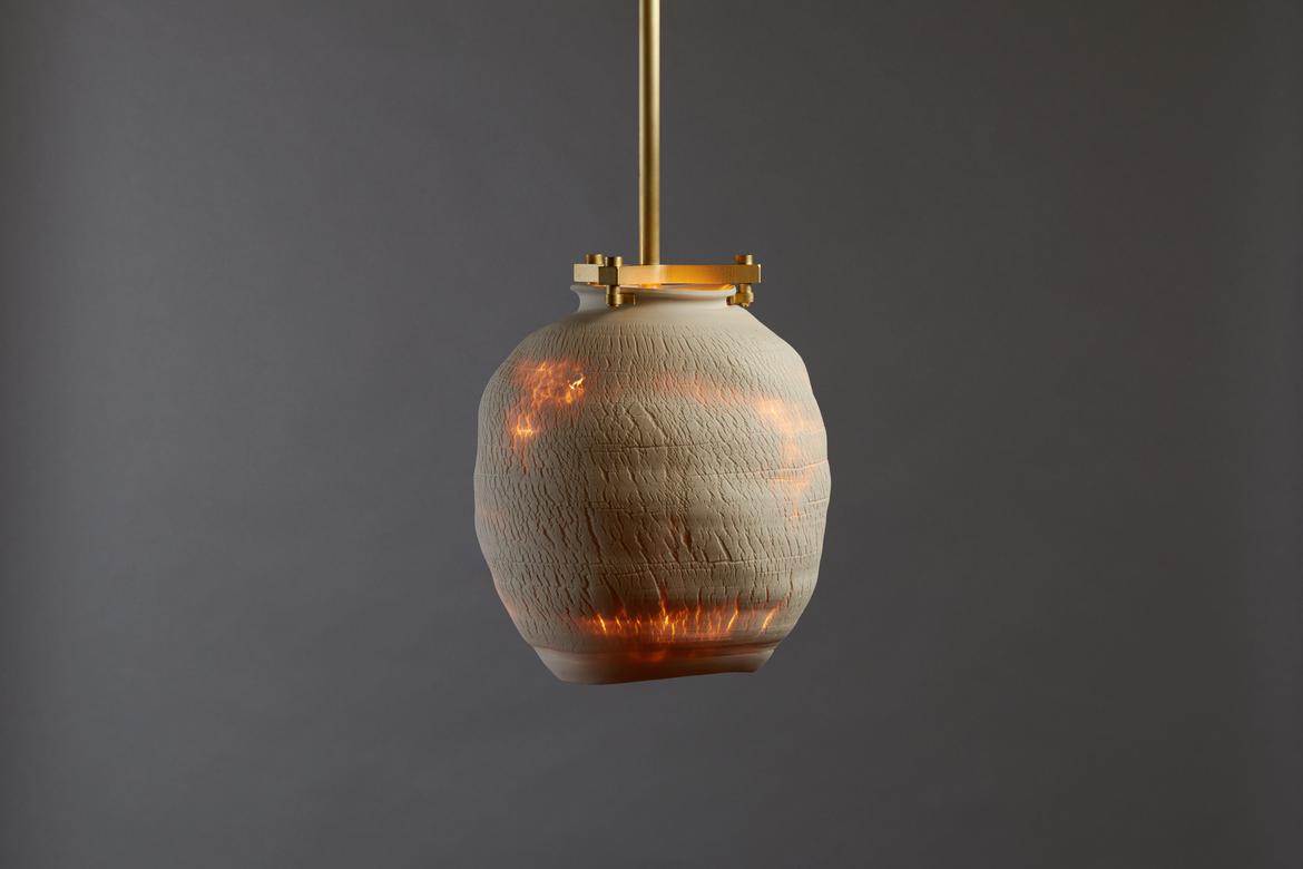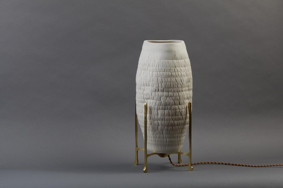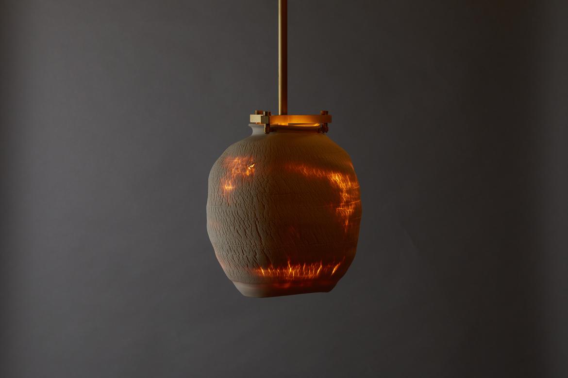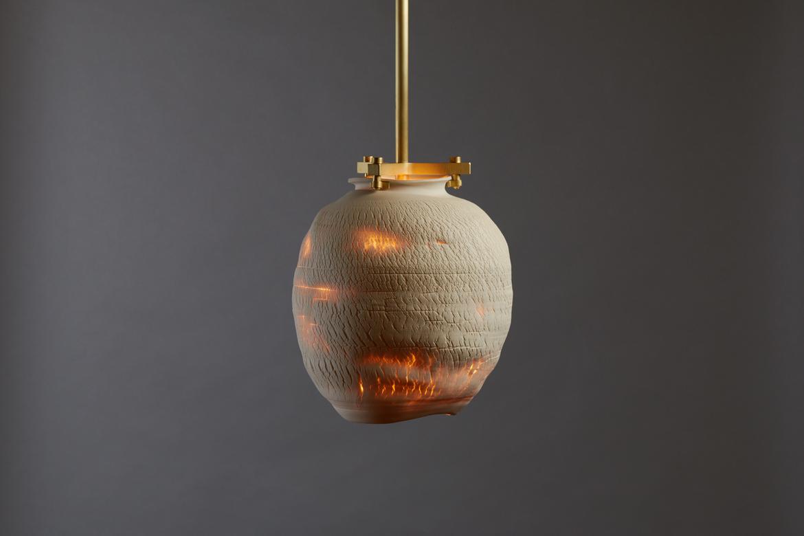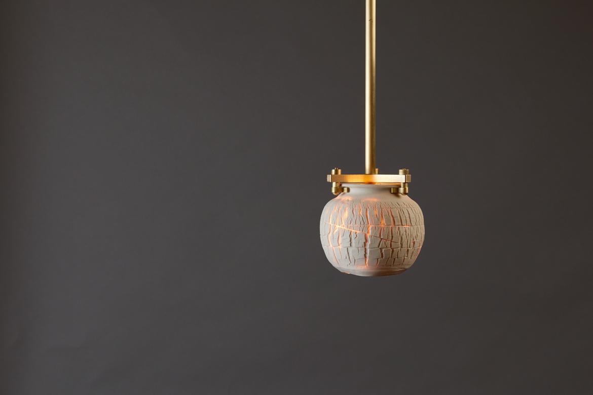 Inspired by the beauty of a dried-out desert lake bed, each piece is a handmade one-of-a-kind object that produces a mysterious quality when internally lit, embracing the flaws and accidents inherent in the craft and process of making: the series exemplifies the wabi-sabi ethos of acceptance of transience and imperfection.
