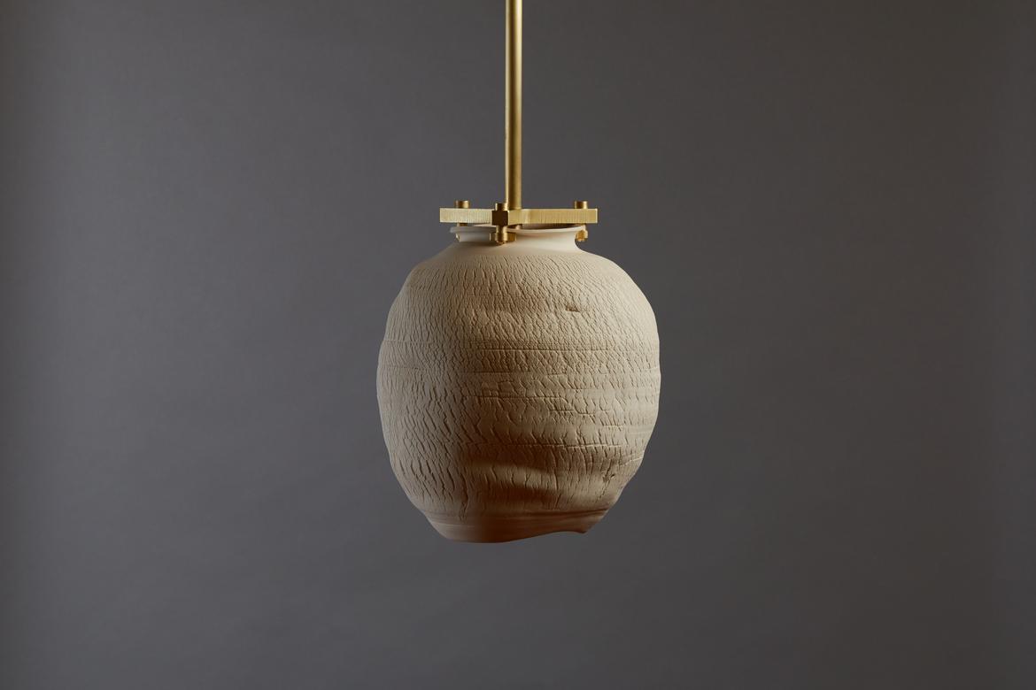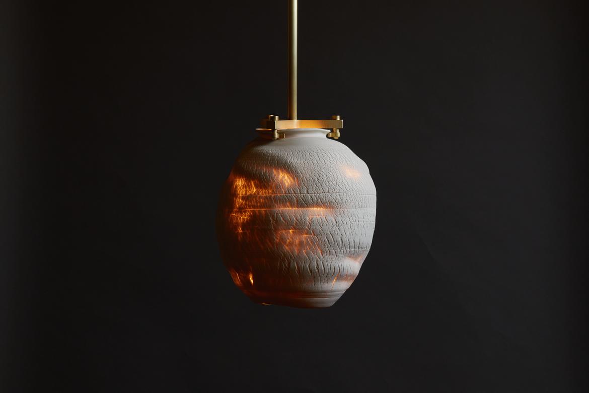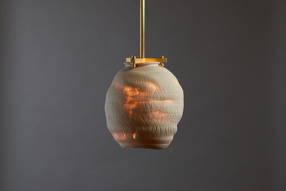 Each piece in the Desert Series is a unique work of art, made of porcelain using a unique fabrication technique developed with Paone’s paternal aunt, the ceramicist Anne Paone. Two new additions in this series, the Desert Table Lamp and Large Desert Pendant in the Negative Finish, offer the same visual and textural elements in an alluring shade of black with blackened brass hardware. The Negative Finish, conceived with new collaborator ceramicist Jeff Nimeh, takes the original series and inverts the aesthetic using metallic oxides and carbonates.