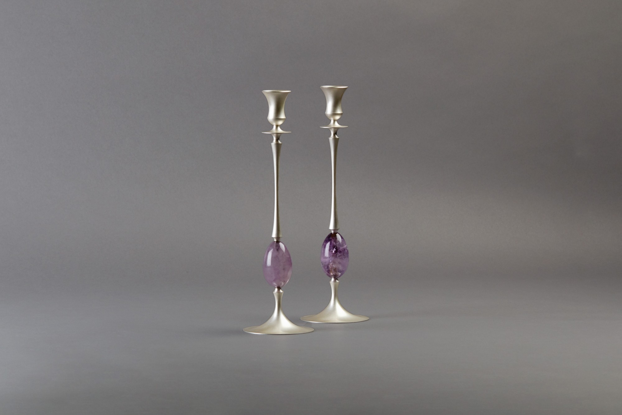 The candlesticks are based on three basic shapes: the egg, an attenuated rod, and a trumpet form. Permutations of these convex and concave shapes have yielded 5 different pieces. By combining and varying these, Muehling has created 17 different candlesticks that can be used individually, in symmetrical pairs, or in groupings of 3 or more. They are available in burnished brass, oxidized bronze, polished or pumiced sterling silver plate, or pumiced 24k gold plate. The darkened bronze accentuates the silhouette, emphasizing a neoclassical origin, while polished or pumiced surfaces enhance the play of light on the forms.